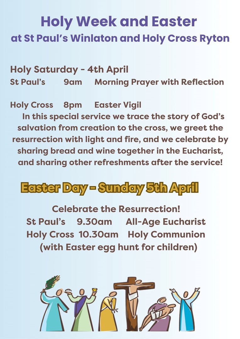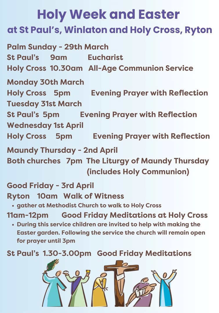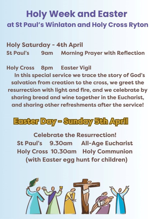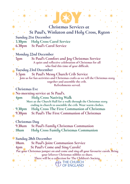 There will be no service at Holy Cross on Sunday, 28th December. Instead there will be a Joint Service of Holy Communion at St Paul's Church, Winlaton at 10am.