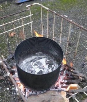 Here's the old can which comes out once a year, filled with ripped up palm crosses and prayer leaves, put on a mini bonfire ...