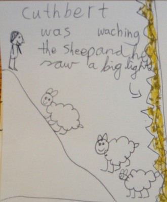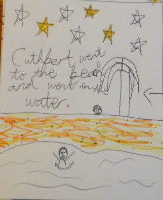 But somehow he knew he must do nothing and stay still. Cuthbert waded out until the water was at his chest, and there he stayed, occasionally letting his arms drop into the sea. There seemed to be music on the air as well as the swish of the water at the shore. Was Cuthbert singing? The hours went on. Surely, Cuthbert was freezing! Yet he seemed to be, well, glowing with joy in the moonlight. So strange.