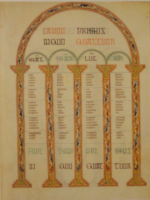 The meet on Palace Green for our group booking into the exhibition. Included are many ancient manuscripts including Cuthbert's own copy of St John's Gospel which he took on his missionary travels around Northumbria. That beautifully made little book is the oldest book in Europe still to have its original covers. Cuthbert's pectoral cross and his portable altar, and super audio visuals about his times and the reason for the long journey from Lindisfarne to Durham long after his death. The page of the Lindisfarne Gospels itself which was open for us to see was one similar to the one below, copied from the exhibition brochure. These pages are part of the index, and offer a cross referencing table between the contents of the four gospels. The tiny detail of the colour illustration everywhere is awesome, worked 1300 years ago.
