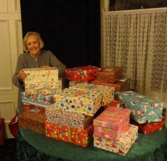 Here's Hazel James with some of them, on their way to be checked and then shipped to eastern Europe and elsewhere as gifts for children who would otherwise be getting next to nothing for Christmas. We are up on last year's number. Well done one and all for the effort and the care taken. TJ.