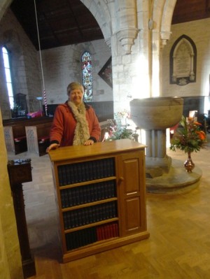 As you see, the cabinet is on casters so that prior to a main service it can be moved to the ideal position from which the sidespeople can welcome people and give them what they need for the service. Here's Maureen Dunn, a great friend of Hilda's, and in her latter years her main carer, very pleased that we at last have a public way of remembering someone who was so special among us.