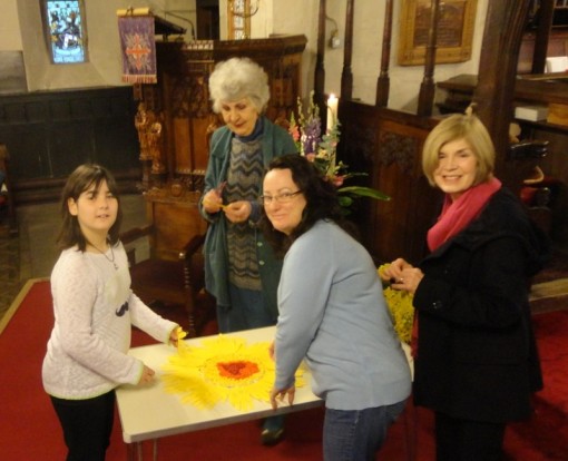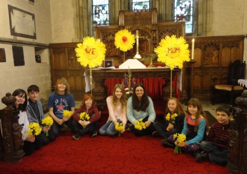 Some of the children who made our Mothering Sunday celebration this year! After presenting a super sketch of the Birth of Moses as recorded in the Book of Exodus [yes, lots about women's bravery there!], we were all invited to write on the five fingers of a yellow hand, five statements: thanksgivings for our mothers; or concerns for vulnerable women elsewhere in the world; or prayers for family life; or ... as you feel inspired. Then these yellow hands and prayer-fingers were stuck onto three discs and look what we got! It was delightful, and it was also very moving. Thank you to our Young Church and Youth Church for coming up with all the ideas for a great Mothering Sunday All Age Communion!