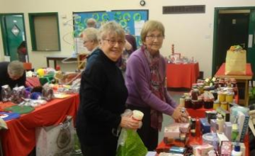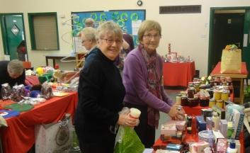 Norma and Anne preparing their stall at the Christmas Fayre